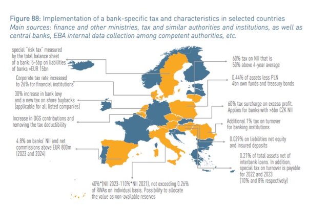 Hungría grava el 0,21% sobre el total de activos, excepto préstamos interbancarios y ha creado un nuevo impuesto sobre el volumen de negocio del 10% en 2022 y del 8% en 2023. Lituania impone un impuesto del 60% sobre el margen de intereses un 50% superior al promedio de los cuatro últimos años. Polonia grava un 0,44% del activo, activos morosos, fondos propios y bonos del Tesoro. República Checa aplica un recargo fiscal del 60% sobre el exceso de beneficios. Rumanía impone un impuesto adicional del 1% sobre el volumen de negocios.