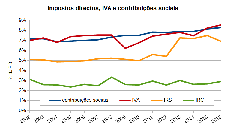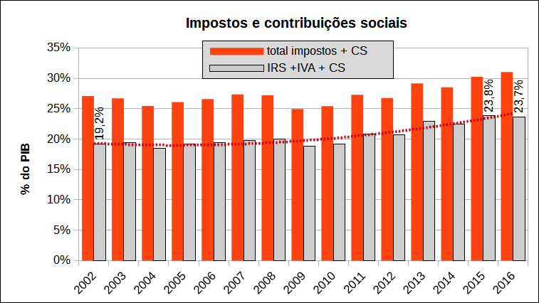 Este gráfico mostra que o volume do IRS+IVA+contribuições tem aumentado continuamente. É aqui apresentado em percentagem do PIB, a fim de mostrar que parte da riqueza colectivamente produzida é conduzida para o Estado e para a Segurança Social.
