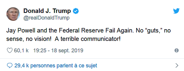 Na terça-feira, 17 de setembro de 2019, no mercado interbancário e no mercado dos money market funds, os bancos viram-se na contingência de aceitar pagar juros na ordem dos 10 % se quisessem ter acesso ao crédito, enquanto a taxa a que a Fed emprestava dinheiro aos bancos rondava os 2 a 2,25 %. Por isso, face à pressão do grande capital e de Trump, a Fed emprestou aos bancos privados 53,2 mil milhões de dólares ao fim do dia 17 de setembro. E no dia seguinte, novamente sob pressão de Trump, dos grandes bancos e das grandes empresas, a Fed baixou a taxa de juros oficial pela primeira vez em 3 meses. Na quarta-feira, 18 de setembro, a taxa da Fed fixou-se em 1,75 % e 2 %, ou seja, desceu 0,25 %. Apesar desta descida, Trump exprimiu mais uma vez uma crítica dura, via tweet: «Jay Powell and the Federal Reserve Fail Again. No “guts”, no sense, no vision!»