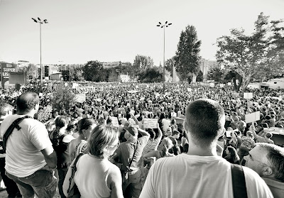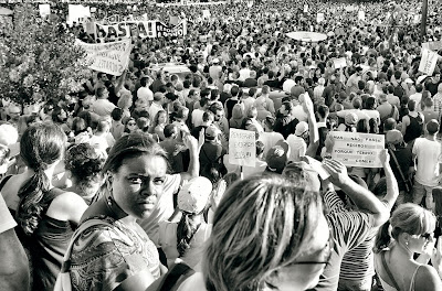 Por tudo isto, e não apenas pela força dos números, a manifestação de 15-Set-2012 foi uma demonstração clara do espírito de revolta que vai alastrando no país. Em termos estritamente numéricos, a única coisa parecida de que temos memória foi o 1.º de Maio de 1974, quando um milhão de pessoas saiu à rua em Lisboa (nessa época a população lisboeta era bastante superior à actual). Há, no entanto, uma diferença importante a assinalar: sentiu-se qualquer coisa de profundamente comovente no Maio de 1974, quando um milhão de gente a rir e aos pulos na rua cumprimentava e abraçava fraternalmente o companheiro ou a companheira do lado, fosse quem fosse. É esta alegria vitoriosa que falta somar ao que vimos este fim-de-semana nas ruas de Lisboa e do Porto.