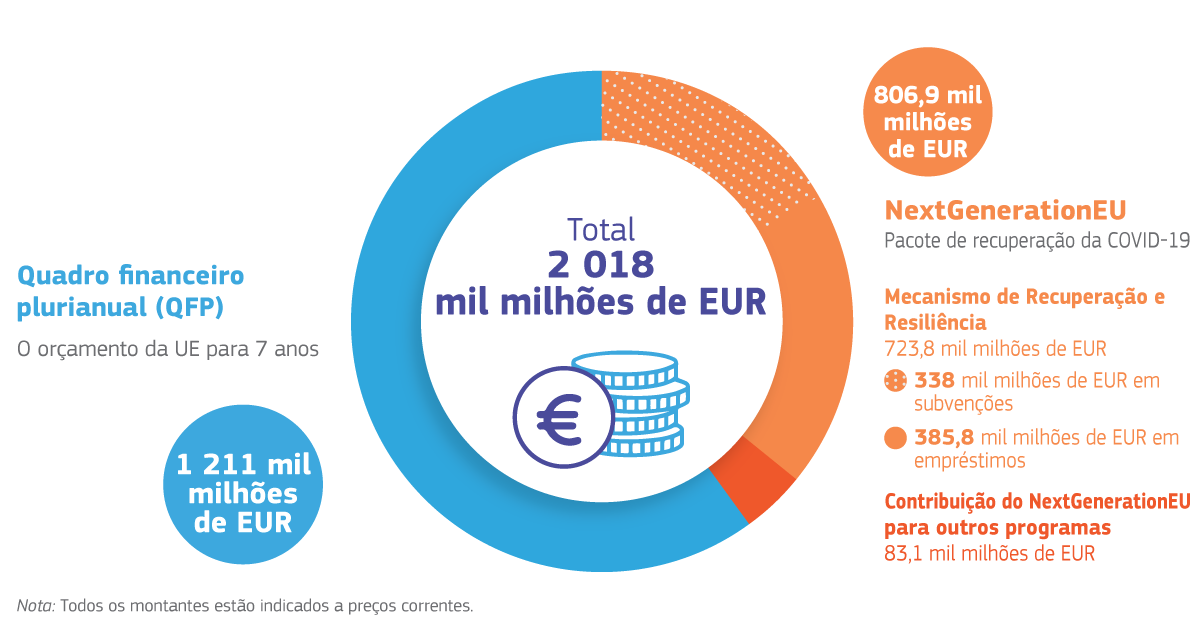 O plano orçamental europeu plurianual (2021-2027) criou um fundo denominado Next Generation EU (NGEU) que disponibiliza um total de cerca de 806,9 mil milhões de euros, dos quais 723,8 mil M€ são destinados a sustentar o «pacote de recuperação da covid-19», conhecido pelo nome de Mecanismo de Recuperação e Resiliência (MRR). Existem dois logros semânticos embebidos nesse plano: