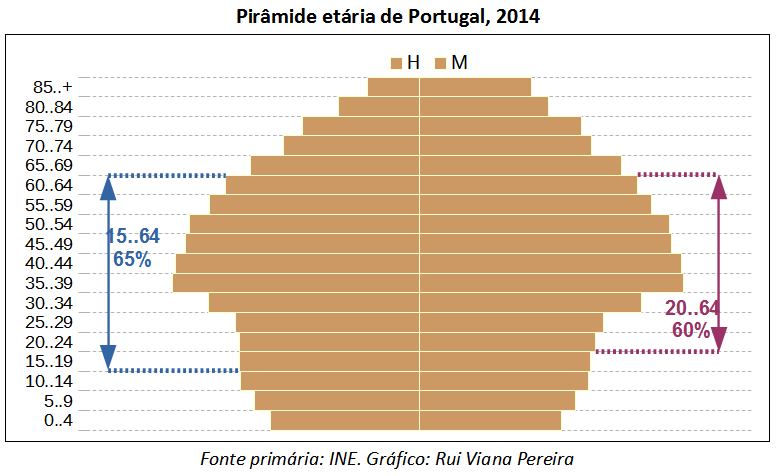 Por conseguinte temos de adoptar um novo método: quando se compara a pirâmide etária de diferentes épocas, deve-se comparar, por exemplo, o escalão dos 15 aos 64 anos em 1960, com o escalão dos 20 aos 64 anos em 2014. Se compararmos escalões iguais, o resultado será matematicamente coerente, mas socialmente absurdo.