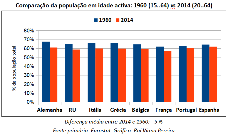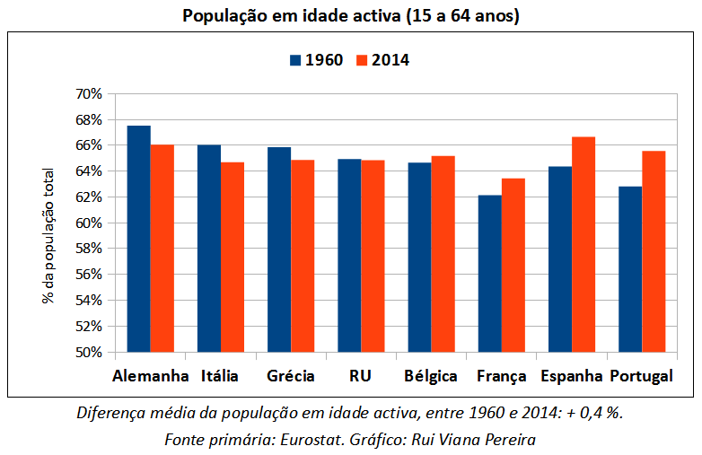 A percentagem de pessoas em idade activa, nos nossos dias, não é inferior à de meio século antes; pelo contrário, a população com idades entre 15 e 64 anos aumentou! – eram 62 % em 1971, são 65 % em 2014.