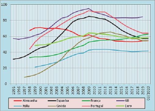 Para o conjunto dos países do euro estes créditos crescem até 2009, recuando depois até aos dias de hoje, abandonando claramente o elevado pendor ascendente verificado até à crise de meados da década. Na Grã-Bretanha, bem como nos países ibéricos, o endividamento das famílias é muito acentuado, com um grande crescimento até ao desembocar da crise financeira, decaindo daí em diante, excepto na Grã-Bretanha, que mantém estável o peso da dívida das famílias nos últimos anos.