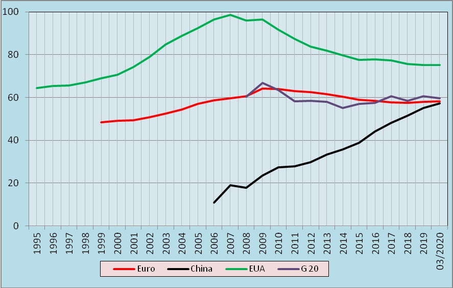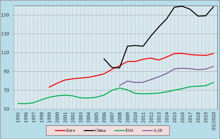 Quando se procede a uma abordagem da situação para grandes agregados de países – zona euro e G20, por um lado, e os dois colossos mundiais, China e EUA, por outro – observa-se (ver gráfico abaixo) uma grande similitude entre os dois primeiros agregados, com indicadores próximos dos 60 % do PIB desde 2006.