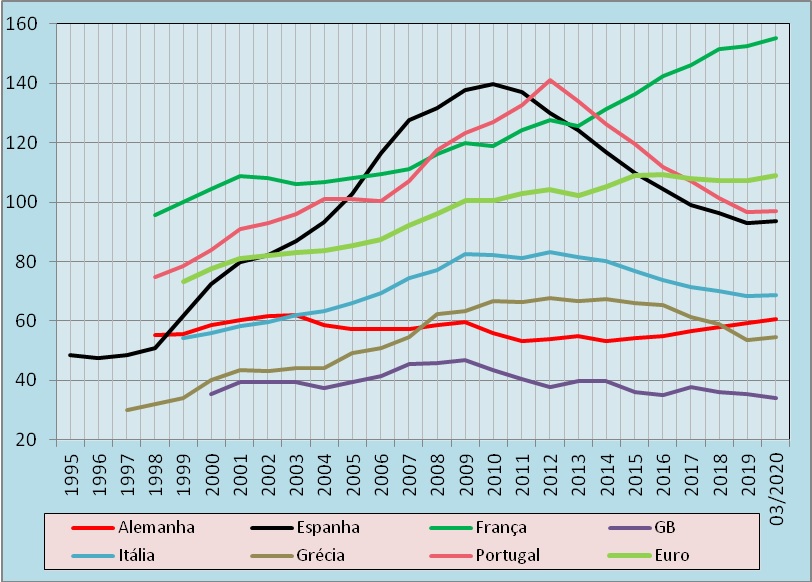 A Itália e a Grécia correspondem ao mesmo perfil referido atrás para Espanha e Portugal mas com cumes muito mais baixos e espaçados no tempo, com níveis de endividamento estruturalmente mais reduzidos. Por seu turno, a Alemanha e a Grã-Bretanha ostentam grande regularidade e pesos do endividamento muito mais baixos para as empresas não financeiras, do que em França, Espanha ou Portugal.