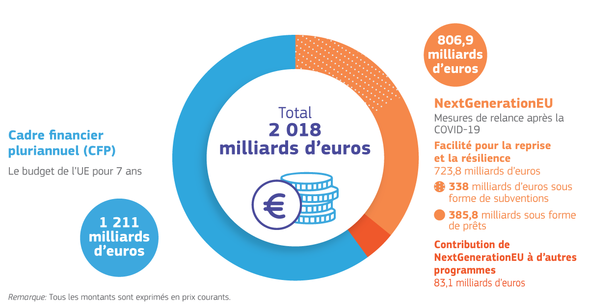 Emprunts financiers : «Pour réunir les fonds nécessaires au Next Generation EU, la Commission empruntera sur les marchés des capitaux, au nom de l'Union européenne, un montant total pouvant atteindre 800 milliards de euros aux prix courants» (source : page de l'UE).